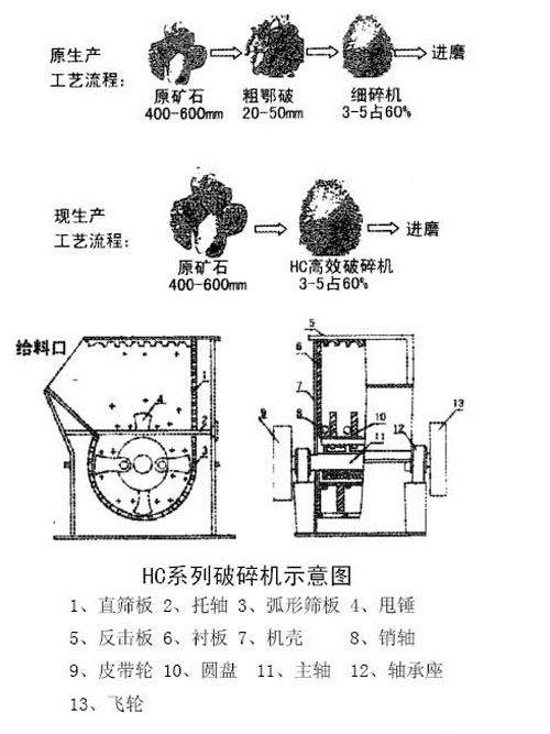 产品概述: HC高效节能破碎机是我公司工程技术人员经过反复实践与探索研制出的 种新型产品,它广泛适用于石料厂。人工砂和水泥生料原料破碎,尤其适宜对石灰石、白云石、页岩、石膏矿、荧石、煤矸石等中硬脆性物料,进料粒度大、出料粒度小且均匀、并且可根据不同需要选择和预定筛板,是矿山、水泥、建材企业比较理想的一级破碎设备。改写了水泥生料设备工艺并减少1/3的设备投资和节省1/2的电耗,省去了大量的维修费用。