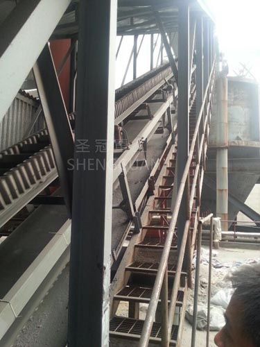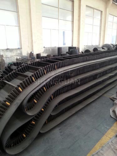 DJ型大倾角皮带转送机其结构是在平形橡胶运输带两侧粘上可自由伸缩的橡胶波形立式“裙边”,在裙边之间又粘有一定强度和弹性的横隔板组成匣形斗,使物料在斗中进行连续输送。可广泛用于煤炭、粮食、建材、化工、水电和冶金等部门,在环境温度为-15℃~+40℃范围内,输送堆积比重为0.5-2.5t/m3的各种散状物料。对于输送有特殊要求的物料,如高温,具有酸、碱性、油类物质或有机溶剂等成分的物料,需采用特殊的挡边输送带,输送倾角0°~90°范围内。