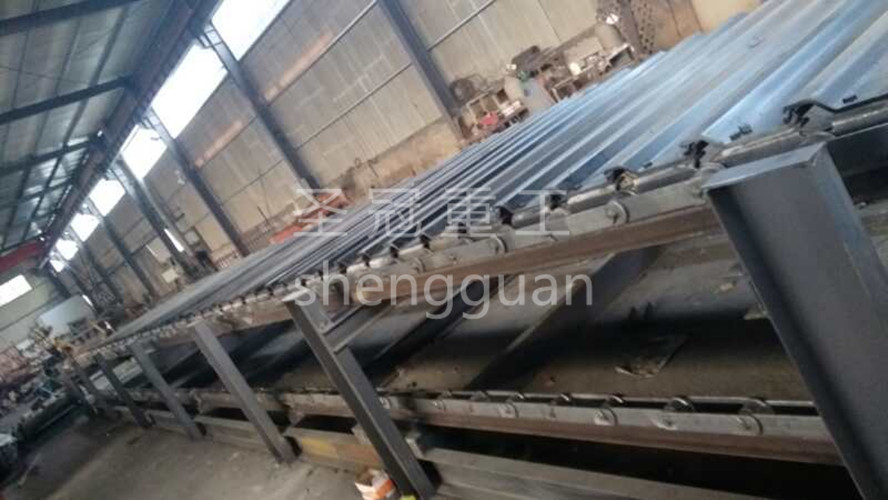 重型链板机(简称链板机),是在中型板式给料机基础上改进设计的。链板机的主动链轮与改向链轮之间,环绕两条环链,链钩与链板联结,链板两侧增加两滚轮,物料的重量均匀压在两滚轮上,驱动装置将动力传至链轮,带动环链和链板运行,达到输送物料之目的,相比较BLQ轻型链板输送机而言更适合长距离输送。