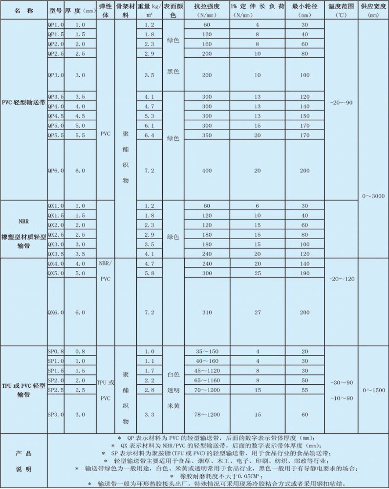 性能分类:轻度爬坡输送带,高度爬坡输送带,加挡板提升输送带,垂直升机皮带,防滑输送带.砂光机输送带,耐磨输送带.较重物品输送带,轻质物品输送带,导向防跑偏输送,打孔吸风输送带(吸风机皮带>,带耙钉输送皮带,螺旋提升输送带,转弯提升输送带,超宽物品输送带,海绵输送带.挖槽输送带,加挡块输送带,封边输送带,槽型输送带,刀口输送带等。