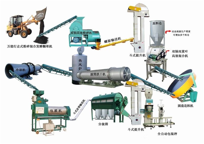 有机肥生产线包括发酵设备、造粒设备、粉碎设备、搅拌设备、筛分设备、冷却设备、烘干设备、包膜设备、自动包装设备等工艺流程。